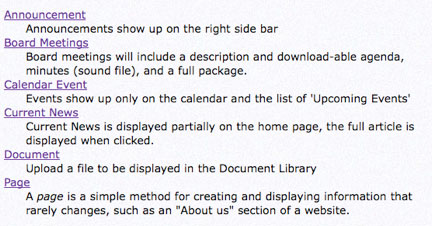 On the admin menu, you will see a link that says “Create Content”. This is a good starting point to get information onto your website. Most sites will be composed simply of Pages. Other content types organize and separate content by where the content is to be displayed on the site. Click on which ever content type you are trying to create to be taken to the “Content Creation Form”.