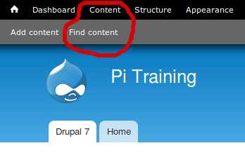 The above method will work for most of your site's content, but not all. Sometimes it is easier to view the content list. This is a list of all your site's content with filters so you can view specific content types only. You access the content list through the top administration menu. Simply click on "Find Content" in the light gray bar, or "Content" in the black bar.