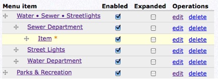 To add a menu item under a parent, click and drag the child item (Ex. “Item is a child of “Sewer Department”. “Sewer Department” is a child of “Water – Sewer – Streetlights”).