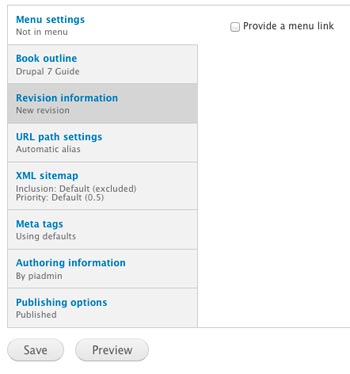 When editing your content scroll down to near the bottom of the page. You should see "menu settings" at the top of the menu in the lower left (left image). Clicking on "Provide a menu link" will cause a lot of options to appear such as menu link title, parent item, and weight. For basic menu editing these are the only three items we will worry about. |