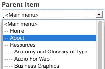 The "parent item" dropdown lets you create submenus. If the parent item is the menu itself, in this case <main menu>, then a new item will be added to the top level of the menu and should be visible immediately after saving these changes. If you select another item as parent, for example: "resources", a sub item will be created. This means that the new menu item will not be immediately visible, but will be a sub menu item. Hovering over the parent, in this case "Resources" will cause a drop down menu to appear which will contain your new item. In the image to the left, the items indented under Resources are all sub menu items. |
