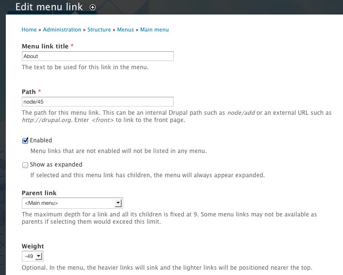 The Parent and Weight options function as described above in the previous section. Congratulations, you now can edit and add links to your menu!