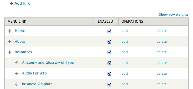 Clicking on "list links" will give you a screen that looks like the image below. Each menu item has three options, enabled / edit / delete. Unchecking "enabled" will disable the menu item, but not delete it. The gray crosses next ot each menu item can be clicked and dragged to restructure the menu. Drag up and down, or pull them to the right underneath another menu item to create a sub-item. "Anatomy and Glossary of Type" is a sub-item of "Resources".