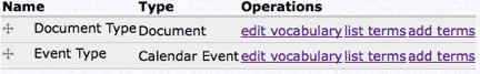 From this menu, new taxonomy can be created, existing taxonomy can be edited, and new terms can be created. Clicking on “list terms” will display all the created terms for this vocabulary type.