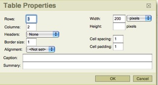 When creating tables, adjust the number of rows, and columns as well as the width (typically it is best to change the width to 100 percent). For most tables, I like to remove the border (set to 0). The cell padding and spacing adjust how far apart the information will be displayed from information in other cells.